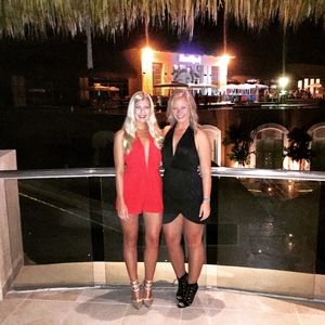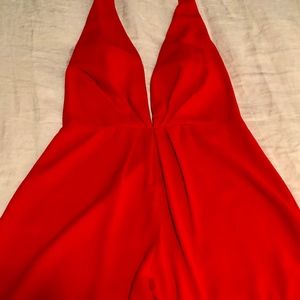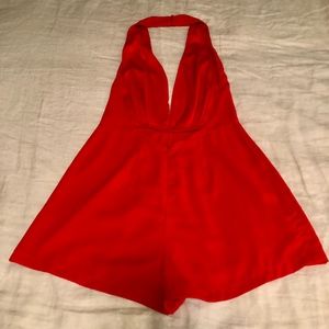 DESCRIPTION - Bright candy-apple red romper with deep V neckline, halter and low back.