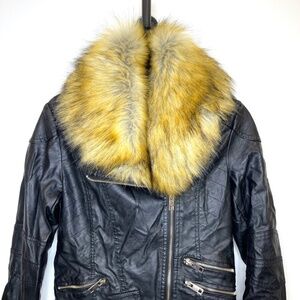 AKIRA Faux Fur Tan Collared Black Leather Moto Jacket Size Medium