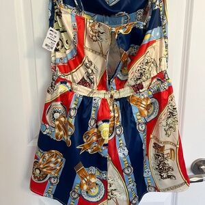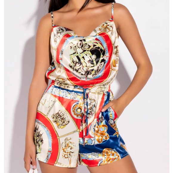 Get into it! The AKIRA Label Into This Cowl Neck Romper is made from a satin fabrication and features a cowl neckline and a multicolor vintage scarf print complete with a cinched elastic back with drawstring waistband, side pockets, a keyhole back detail, and attached mini shorts.