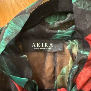 AKIRA Long sleeve red rose print blouse. Features delicate tie at neck, flowy sleeves and hip length. Sheer fabric, rose design on black background.