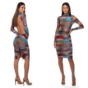 The AKIRA Label Mel Printed Open Back Midi Dress features a stretchy, mesh base fabrication, a vibrant, paint brush graphic print, mock neckline, long sleeves, midi length, and ruching down the sides and back. Complete with a form-flattering, bodycon fit, gorgeous open back, smooth inner lining, midi length, and buttoned back neck closure. Dress it up with stilettos for an effortlessly chic night out.