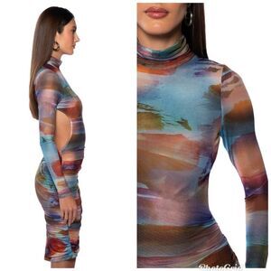 This stunning multicolor dress features a unique ruched design and long sleeves, perfect for any occasion. The vibrant colors make it a standout piece in any wardrobe.
