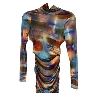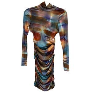 AKIRA MEL PRINTED OPEN BACK MULTICOLOR LONG SLEEVE RUCHED MIDI DRESS SIZE M