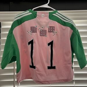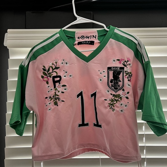 AKIRA jersey with pink base and green sleeves. Floral embroidery and sporty number design.⛔️NO TRADE, NO RETURN brand new worn once for a game !can fit a small or medium size sale as it is