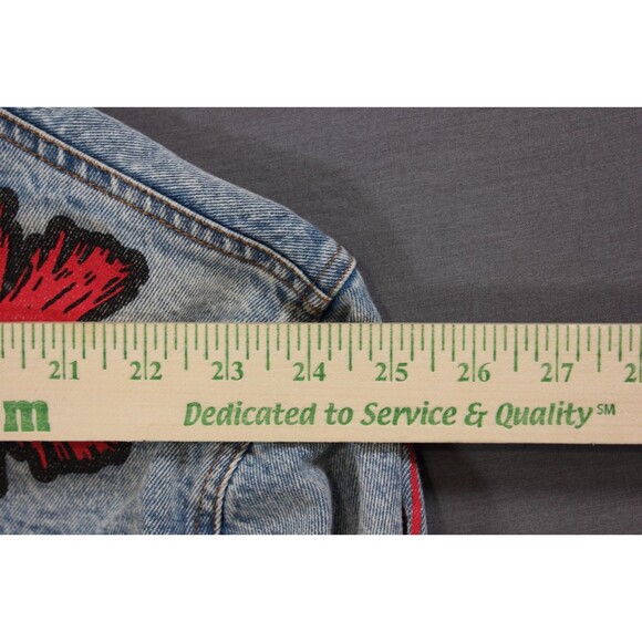 The AKIRA Rude Jacket is a stylish denim jacket featuring a painted graffiti design in Azalea Wang Paris style. Made from 100% cotton denim, this long sleeve jacket has a classic fit and button closure. Ideal for various occasions such as traveling, parties, casual outings, or workwear, this jacket is a versatile addition to any wardrobe. The geometric pattern and Paris theme add a unique touch to this fashionable piece from the Akira brand. Machine washable and in size Large, this jacket is sure to make a statement whether it's winter, spring, summer, or fall.