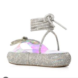 Stunning silver gladiator sandals. Rhinestone embellishments. Perfect for a glamorous look.
