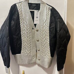 Short bomber jacket with cable knit in silver in front, waist an wrist bands. New with tags. Size Medium. Stitching off on the left side of the front pocket. Silver buttons.