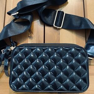 Features a vegan patent leather fabrication, quilted design, zip top silhouette, and a removable, adjustable shoulder strap. Perfect for day-to-night ensembles. - All man-made materials - 3.5” height x 8” width