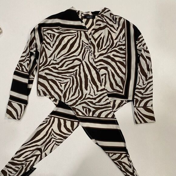 Bold and chic AKIRA zebra print blouse in silky satin-feel fabric. Features long sleeves, a V-neckline, and a stylish tie-front detail for an adjustable fit. Size M (Medium).