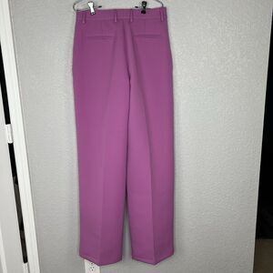 Elevate your wardrobe with these stunning AKNVAS high rise pleated straight leg trousers in a beautiful orchid pink color. These dress pants feature a zipper closure, zipper accents, and pockets for added convenience. The lightweight and stretchy polyester material make them perfect for any season, whether it be winter, summer, fall, or spring.