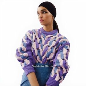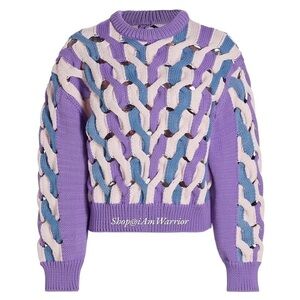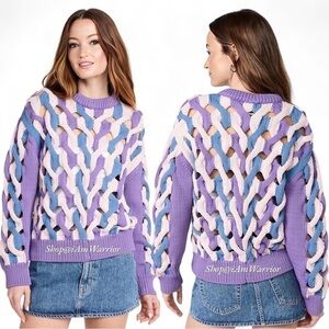 AKNVAS gorgeous purple, white & blue lattice open knit crewneck sweater is perfect with denim and sneakers for a contemporary look. EUC. Sized small but oversized style could easily accommodate a range of sizes. See photos for measurements. Shown here with my J.Crew Collection leather skirt, sold separately.