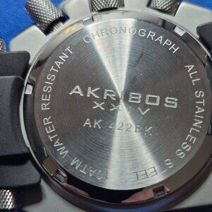 AKRIBOS, AK422BK, chronograph watch. 42mm case, screw down crowns and case back. Black rubber strap, new battery. Comes with original box and papers. GB06