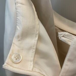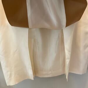Elevate your wardrobe with this luxurious Akris silk skirt, featuring an elegant colorblock design in ivory and camel. Crafted from 100% silk with a 100% viscose lining, it offers both comfort and sophistication. The skirt includes a hidden zipper closure and is fully lined for durability. Unique details include four slits—two in the front and two in the back—for added movement and flair, making this piece both practical and stylish.