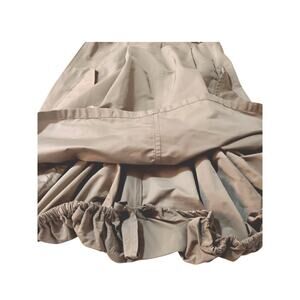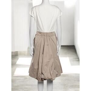 Featuring a windbreaker-type skirt fabric, snap pockets, and a bubble drawstring hem, this dress offers a utility avant-garde look. Bodice is a soft cream knit.
