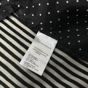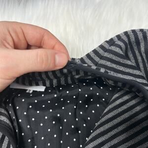 Structured grey and black striped long sleeved blazer jacket with black pipping trim and tailored details. There are hook and loop closures on the front, and two open slant pockets on sides. Black and white polka dot interior lining.