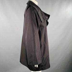 AKRIS coat in a black silk featuring a large lapel with side zipper details, long sleeves, and asymmetrical hidden zipper closure. Made in Romania.
