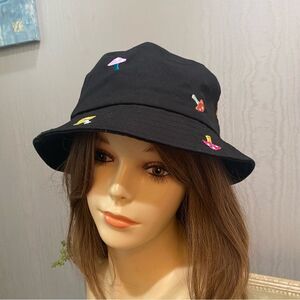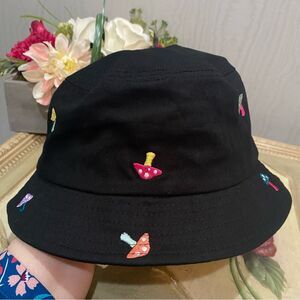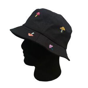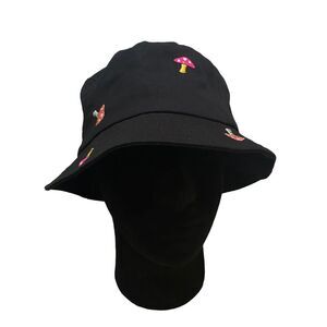 A-LAB Black Cotton Whimsical Embroidered Mushrooms Bucket Hat