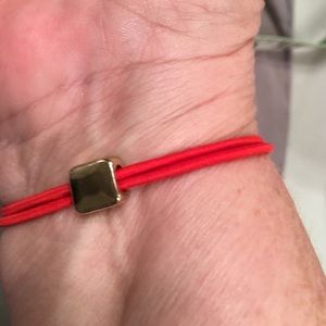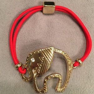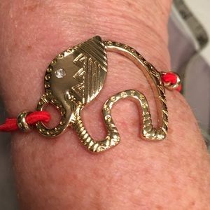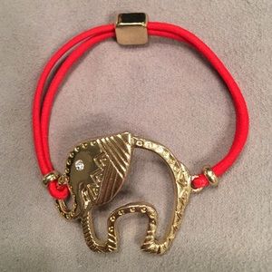 Elephant Bracelet gold tone & red band. Red band stretches 5" on red band and 2" on elephant. Elephant is approximately 1 1/4" tall x 1 1/2" wide.