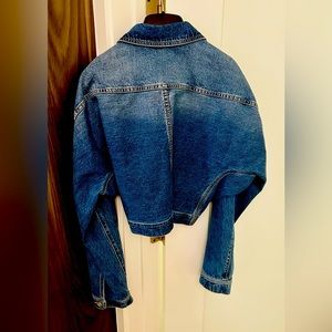 From Alaia’s current collection and crafted in Italy, this unique cardigan/bolero style denim jacket is slightly cropped with two patch pockets at the front and silver buttons at the wrists and high neck.