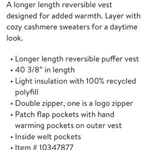 New with tags. Longer length reversible vest. Runs big.