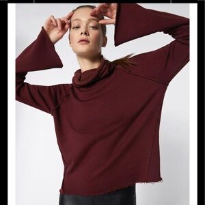 The Riki Pullover from Alala a French terry pullover with a wide funnel neckline and bell sleeves for a fluid and feminine silhouette. raw edge hems and velvet taping at front adds a little edge to this essential sweater. Wear as a layering piece to and from the studio or as a soft knit pullover in chilly weather.