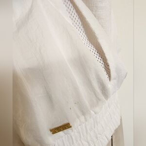 luxury athletic wear company Alala light running jacket- two tone- cream part has a shine- almost iridescent- there is mesh paneling inside in spots which looks cool showing through the fabric- layer up for summer and spring! really cool yoga jacket sport jacket tennis jacket. very tiny small lots near elastic waistband next to metal branding tag as shown- not noticeable! added pro photos of another colorway so you could see it better
