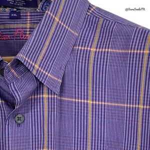 ALAN FLUSSER men’s big & tall plaid long sleeve button down shirt. Plaid is purple, blue, & orange. Paisley lining at cuffs & inside of collar. One pocket. Business casual. Has always been professionally cleaned & pressed at the dry cleaners. Excellent used condition. No holes or stains. Fabric: 100% cotton. Size XXL…2XL. Retail $275.