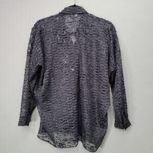 Beautiful black textured sheer button down blouse. No size/ fabric content tag but this blouse fits a size 4-6 manequin. See measurements photos for size and fit.