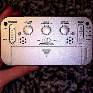 Alarm Clock, On/Off Switch, Button to Change Month and Year, Button to Change Celsius/Fahrenheit and Minute/Date, Button to Change Hour/Month, Switch to Set Run/Alm/Date/Time, Switch to Turn Backlight On/Off, Button on Top for Snooze/Light