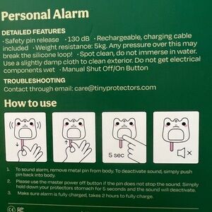 Stay safe with this frog alarm protector. Excellent size to add to your keychain. Adorable frog-shaped keychain with a green strap. Perfect for adding a playful touch to your accessories. COMES WITH CHARGER. Trusted seller.