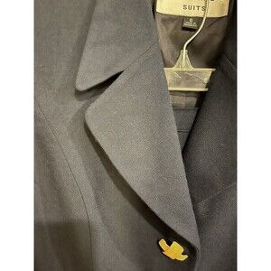 This vintage Albert Nipon skirt suit is a stunning addition to any wardrobe. The blue 100% wool skirt features a tailored look with a waist size of 26 and a size of 8. The matching peplum jacket is also included, with gold buttons adding a touch of elegance.