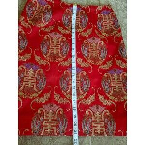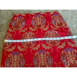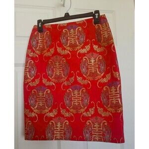 Step into luxury with this exquisite Alberta Ferretti pencil skirt that exemplifies the finest in Italian craftsmanship and design. This breathtaking piece features an ornate Asian-inspired medallion pattern woven in shimmering metallic threads of gold, purple, and blue against a rich crimson red background. The intricate brocade work showcases traditional motifs with swirling paisley details and geometric elements that catch the light beautifully.