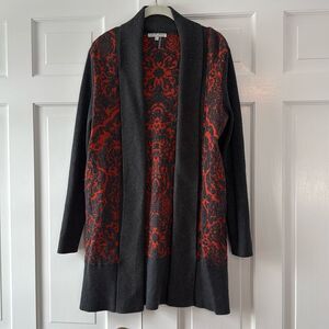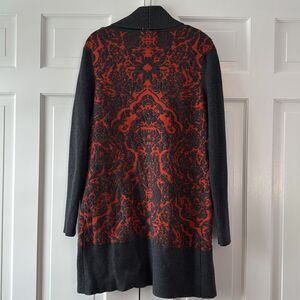 Rich and elegant tapestry-like sweater in orange (or orange-y red) and charcoal gray. Wool (50%) blend. Ribbed arms. Pre-owned in very good condition; scattered pulls. Please note that material/care tag is faded; photo is from another of the same style. Duster.