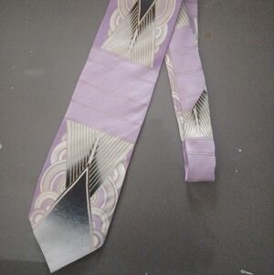This vintage designer original Alberto Zerra tie is a stunning statement. Art Deco Italian design. Lavender, blue, Grey and cream. In good, gently-used condition.