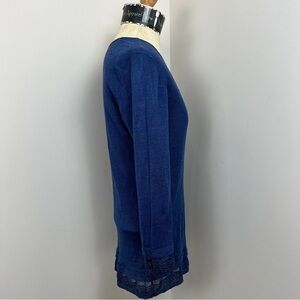 ALBERTOBINI Blue Linen Long Sleeve V Neck Top with Shimmer Edging on sleeves and bottom.