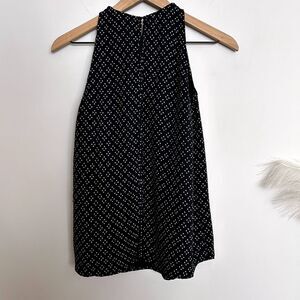 Details: Black and beige sleeveless silk top with scoop neck. Hook closure and an opening in the back. The silk feels really nice and substantial, not thin!
