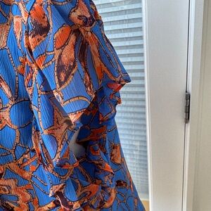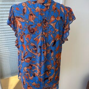 Gorgeous blue and orange blouse. Gently worn. Flutter sleeve. Looks great worn over jeans or tucked in. Dress up or down.