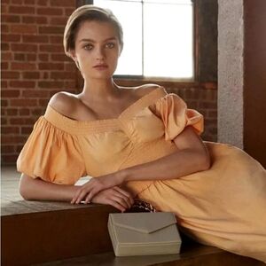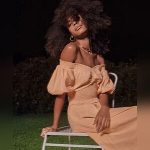 A.L.C. "Adena" combo dress with smocked trim sweetheart neckline that can be worn on shoulder or off