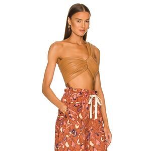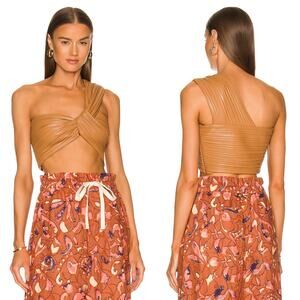 A.L.C. Athena Top in Cashew. Size 4. Features one shoulder style, ruched detail, fitted, knotted, lined, cropped, zipper closure. 95% viscose, 5% elastane. Style 5TOPS01210. Excellent condition, no flaws.