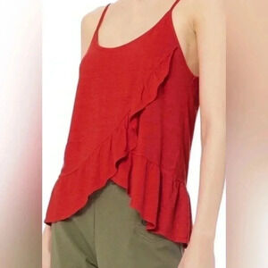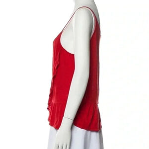 A.L.C red ruffle linen tank. Has ruffle on the front and around hem. Linen makes it lightweight, with a scoop neck. Bust measures around 36 inches, length is about 25. Perfect tank for summer. No flaws observed, offers welcomed.