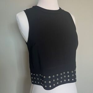 Black crepe sleeveless top with silver grommets at the bottom hem.