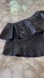 Stylish black leather crop top. Features an off-shoulder design with ruffle detail. Perfect for a chic look.
