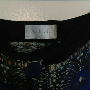 Beautiful ALC silk skirt in blue, orange, black, and white pattern. Fun for tropical escapes or weekend fun.