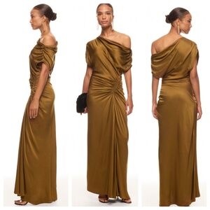 Sophisticated chic bodycon gown in a silky thick satin featuring a draped halter neckline, cut away sleeves asymmetric. side slit , ruching in all the right places and artsy draping, Perfect semi-formal, formal wedding, special occasion, date night, holiday party, new years, cocktail. Flaw see details below