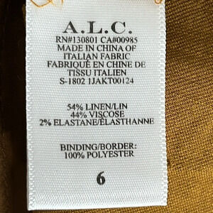 A.L.C. Bryce Belted Mini Skirt in Gold - Size 6. Good pre-owned condition. There were two spots that I repaired. Both were seam issues, one by the pocket and one on the waist connection, and repaired by sewing machine. Model pics are included to show fit and style only. Color is best represented by actual product photos. A minimal skirt that can be dressed up or down. This slim A-line style features a pleated waistband thats belted with a D-ring buckle. Slant front pockets, welt back pockets and hits above the knee. Back pockets have not had the protective stitching released yet.