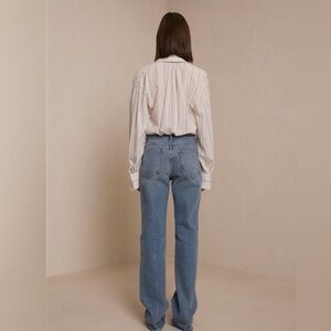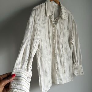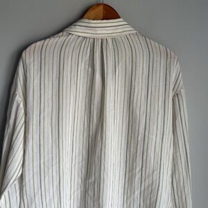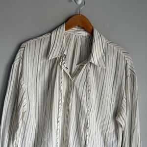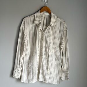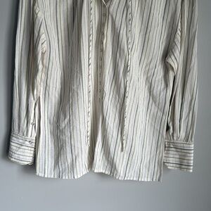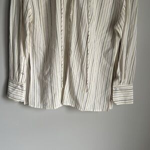 A.L.C. "Carissa" striped top Spread collar with ties; snap front Long sleeves; snap cuffs Relaxed fit Viscose/cotton Made in USA from imported materials