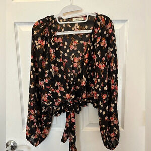 Gently worn and in excellent condition. Cut for a slim fit Non-stretch fabric Black Floral 100% Silk Elastic cuffs Wrap front Dolman sleeves Dry clean only