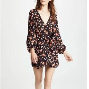 In good preowned condition. Wrap-style mini dress. Long sleeves. Floral print.