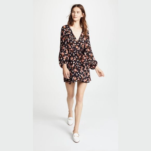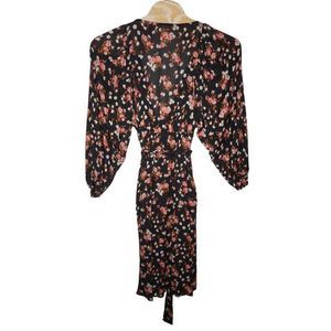For sale is this A.L.C. Carlo Silk Wrap V Neck Floral Print Long Sleeve Mini Dress Size 14 Black. This dress is in excellent condition! This dress features a wrap tie closure, balloon sleeves, V-neckline, and is lightweight.
