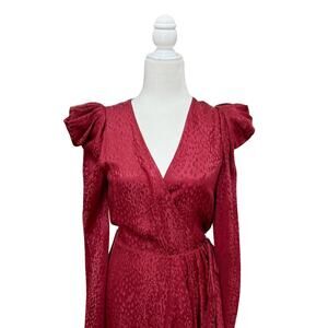 A wrap dress in a bold crimson jacquard, this style features a puff sleeve with a gathered detail along the shoulder and ties at the natural waist creating a classic, cinched-waist silhouette.